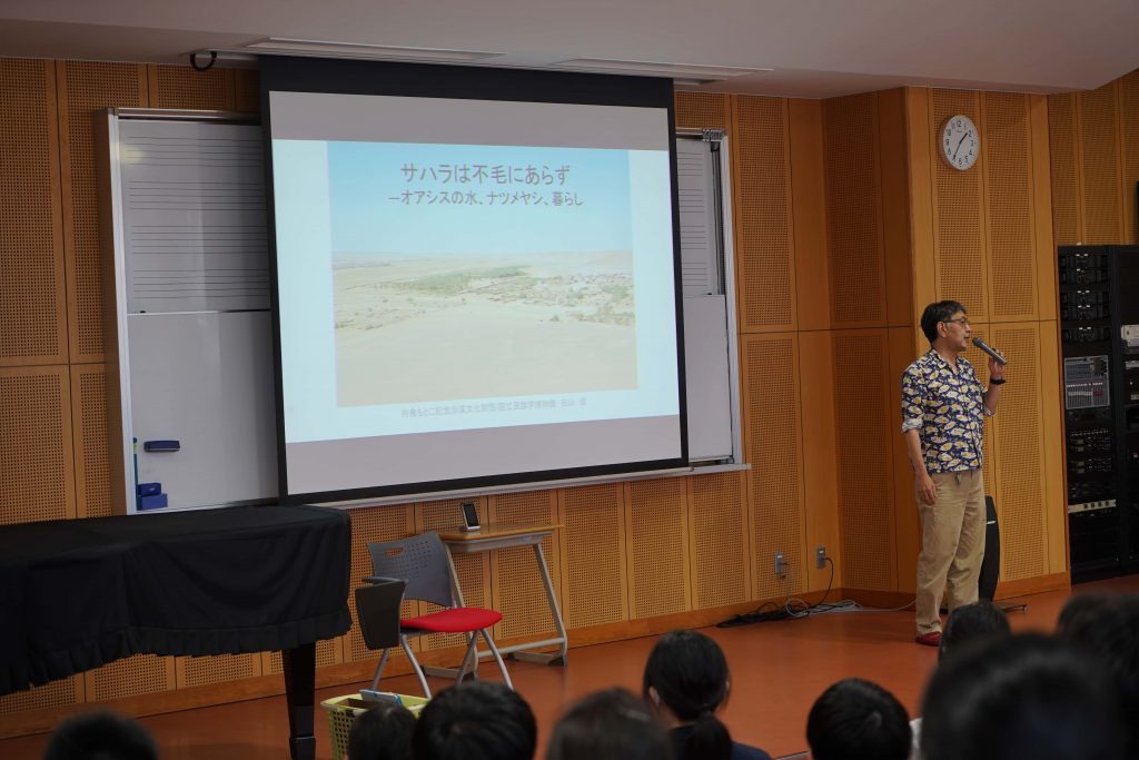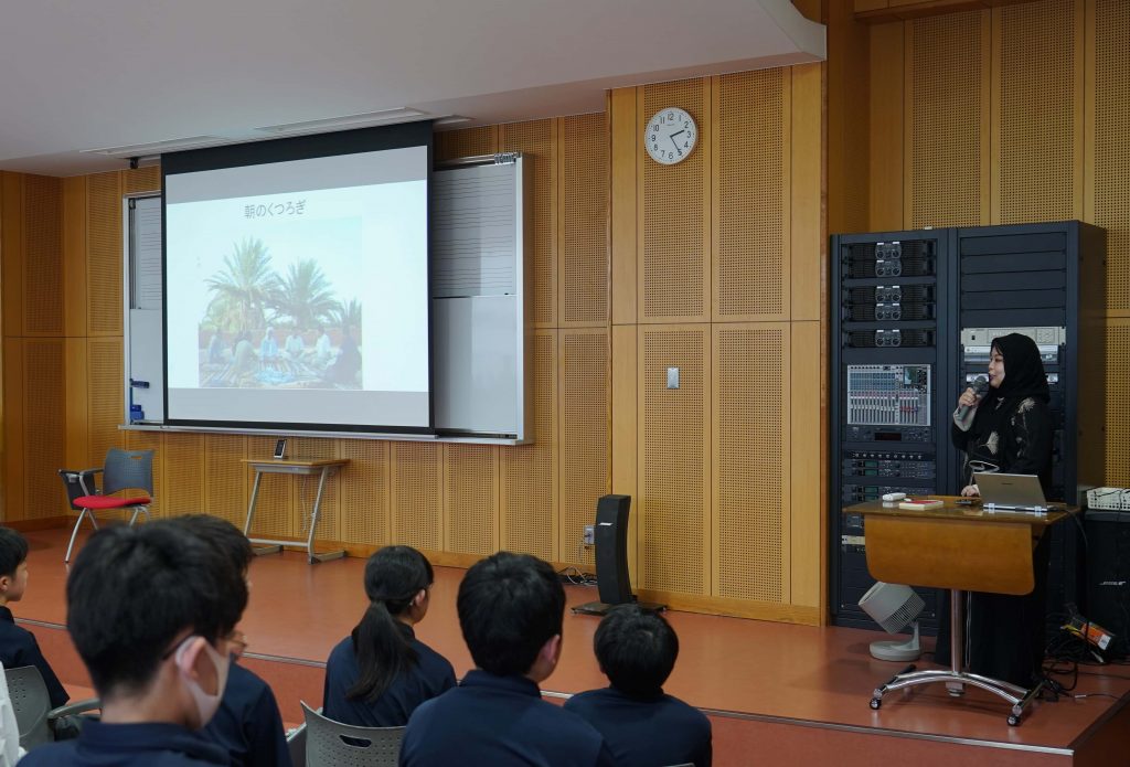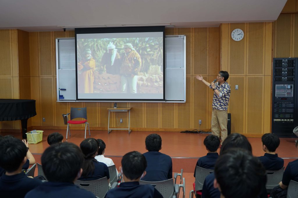 【講演報告】石山理事、藤本主事が講演を行いました 2025年6月17日(火)、埼玉県本庄市の本庄東高等学校附属中学校において、中学1年生72名を対象とした社会科特別授業が行われ、当財団の石山俊理事、藤本悠子事務局主事が講演をおこないました。石山理事は「サハラは不毛にあらずーオアシスの水、ナツメヤシ、暮らし」と題し沙漠文化について、藤本主事は「サウジアラビアの文化と人びとの暮らし」について紹介しました。講演のほかに、現地の衣服の試着体験もあり、生徒の皆さんからは熱心な質問が寄せられました。